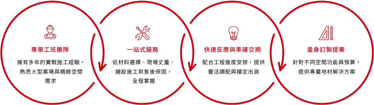 麥司秉持「專業、誠信、品質、效率」的理念,從產品選材、品牌合作、技術施工到售後服務,始終以客戶滿意為優先,致力成為台灣地材市場中最值得信賴的長期夥伴。